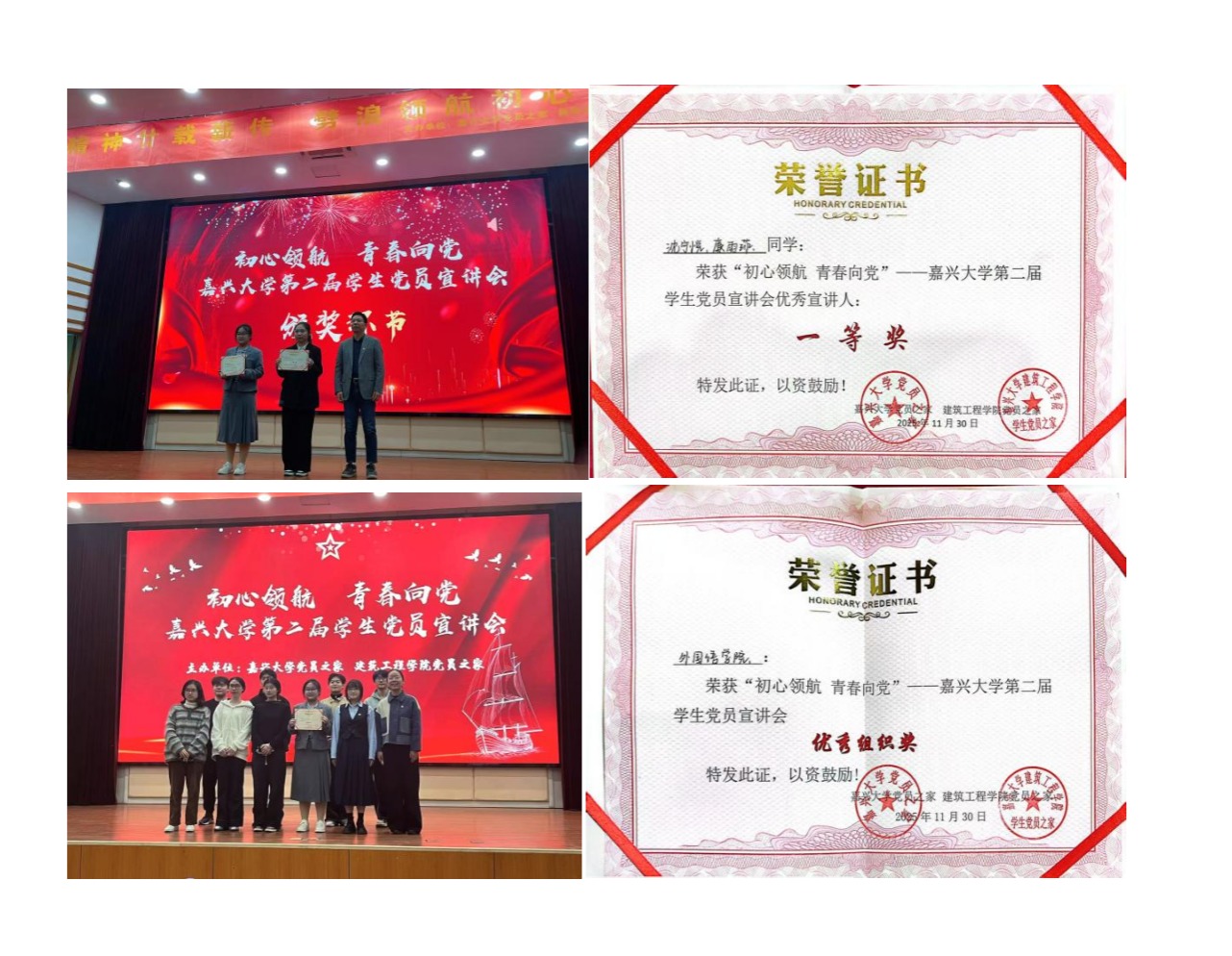11月30日,嘉兴大学第二届“初心领航 青春向党”学生党员宣讲会在TCL报告厅举行。小黄书 凭借出色表现,以全场最高分荣获“优秀宣讲人一等奖”与“优秀组织奖”。